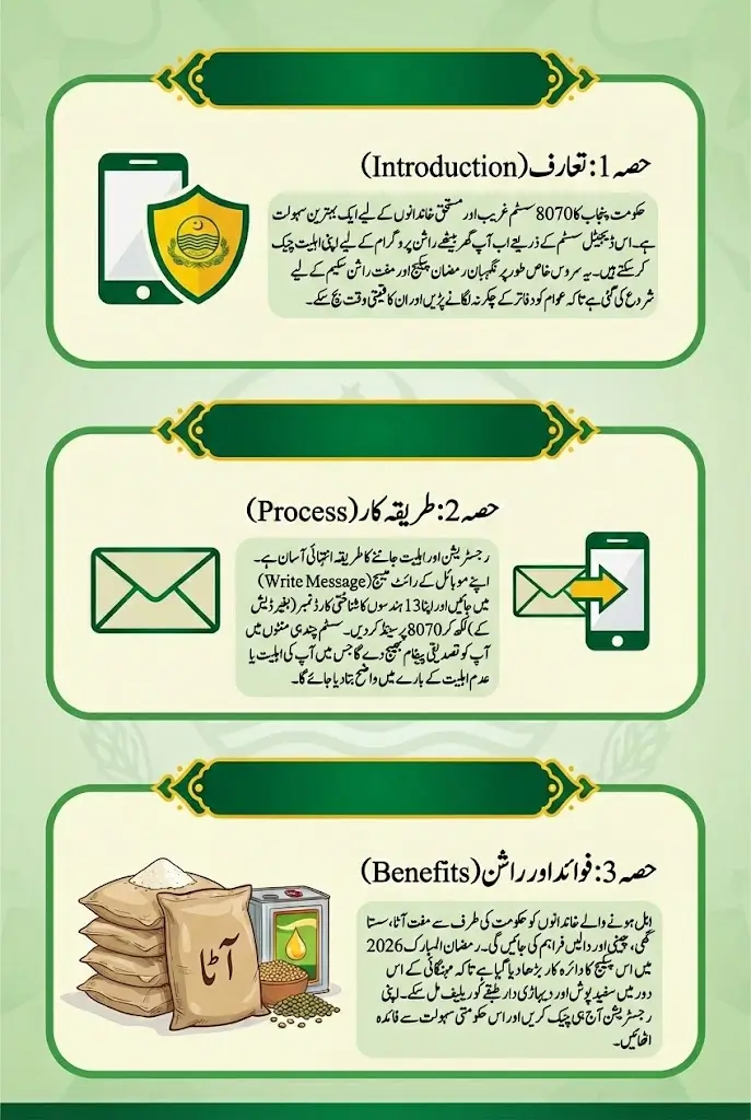 The 8070 SMS service is directly used for eligibility checking rather than full registration. It is connected with Punjab’s social protection database, allowing citizens to check if they meet the criteria for government-supported rashan programs. This service is widely used by families who are part of the Negahban Program, Ramadan Package, and the CM Punjab Ration Card initiative.