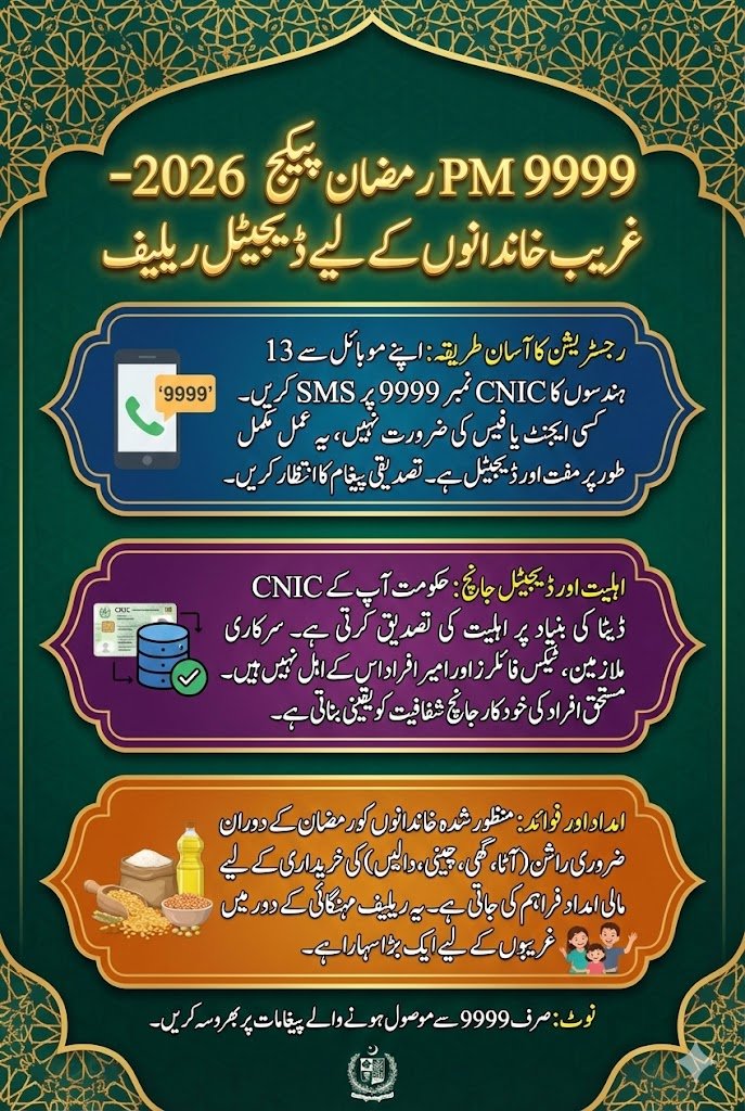 The 9999 PM Ramzan Package 2026 represents a digital and transparent effort by the government to support low-income families during Ramadan. By using CNIC-based SMS registration, the process has become accessible for people in both urban centers and remote rural areas. The elimination of physical forms and middlemen reduces corruption risks and ensures faster verification.