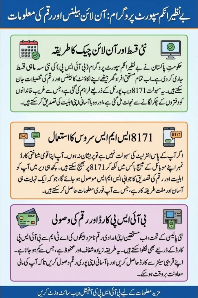 Benazir Income Support Program Check Account Balance System The Government of Pakistan has started online. You can check your account balance in the BISP 8171 online at home. The government of Pakistan has designed a web portal to know complete account balance details in the Benazir Income Support Program.