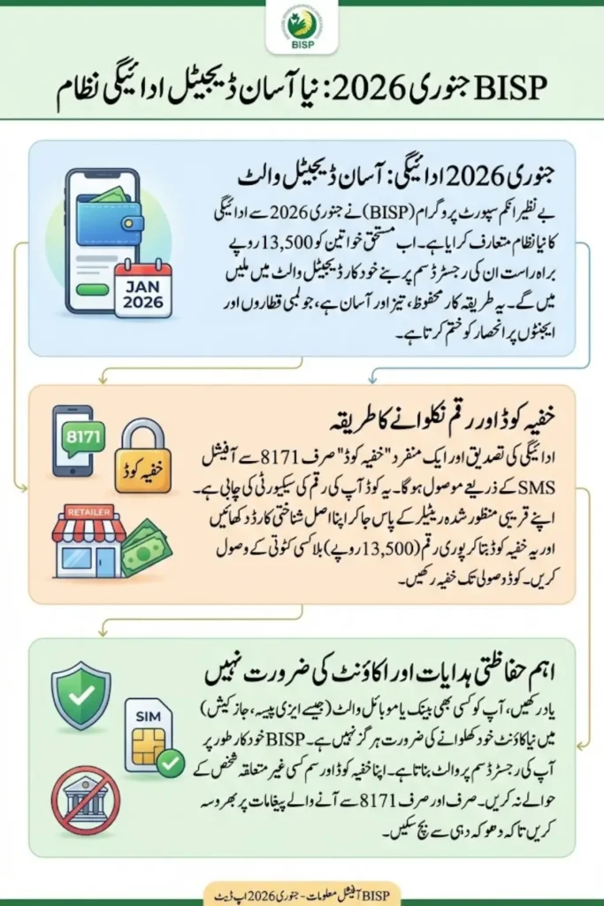 BISP 8171 January Payment has launched a much-improved payment system for January 2026, especially for women beneficiaries across Pakistan. Under this new update, eligible women will receive Rs. 13,500 directly through a digital wallet linked to their BISP-registered SIM. This step has been taken to reduce complaints, stop illegal deductions, and make the payment process safer and easier for ordinary citizens.