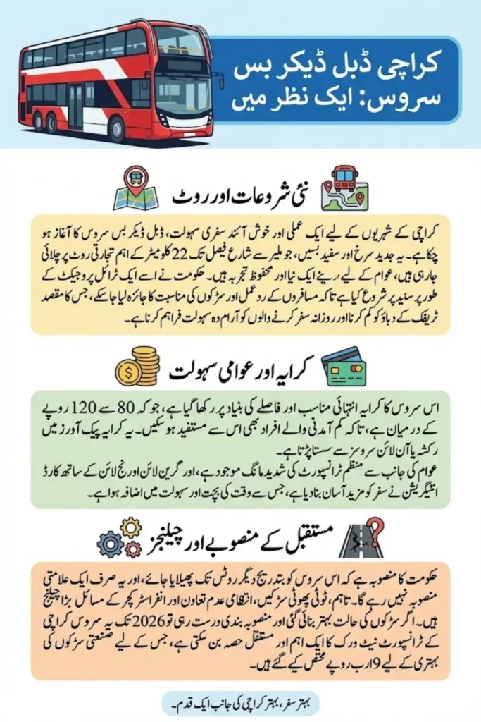 Double Decker Bus Karachi Route launch of the double-decker bus service in Karachi is a welcome and positive step. It provides relief to commuters traveling between Malir and Shahrah-e-Faisal and shows that public transport is finally receiving attention.