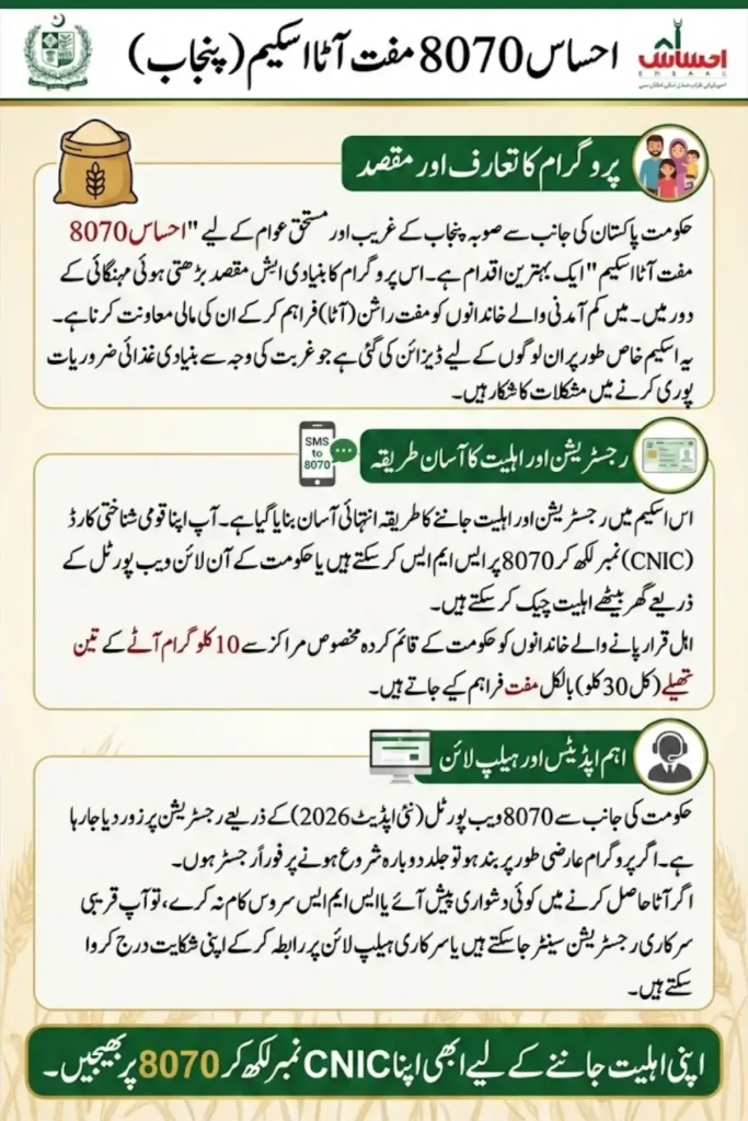 The Ehsaas 8070 Free Atta Scheme is a great initiative by the Government of Pakistan to provide free flour to poor and deserving families, especially in Punjab. Eligible people can easily check their status by sending their CNIC number to 8070 or through the official web portal and receive three bags of 10 kg flour. If you face any problems, you can contact the government helpline and register your complaint. Once the program restarts, make sure to register quickly and secure free flour for your household.