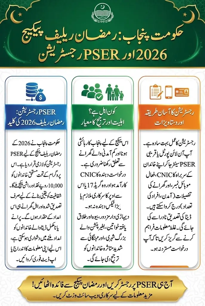 PSER Registration Form 2026 Punjab Government has officially launched the PSER Registration Form 2026 for families who want to receive the Ramzan Relief Package. This program includes Rs 10,000 cash assistance along with a Rashan package for deserving households across Punjab. This year, the government has made it clear that PSER registration is the main condition for eligibility. Without updated PSER data, families may not qualify for financial support before Ramzan.