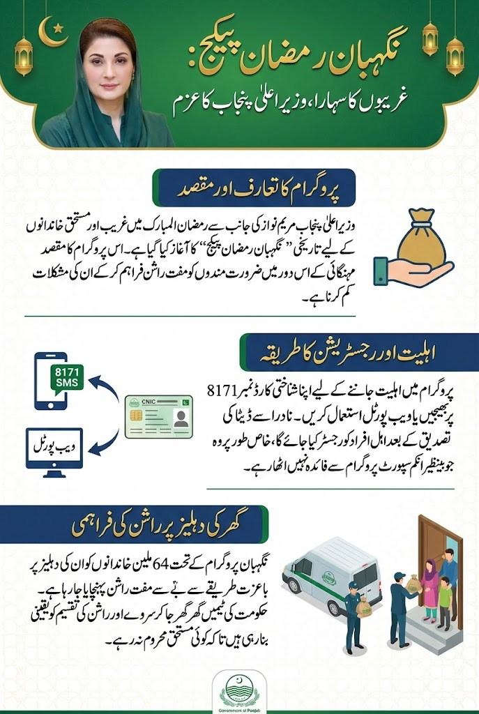The Ramadan Nighaban Program is a Punjab government initiative that provides free ration packs to poor and deserving families during the holy month of Ramadan.