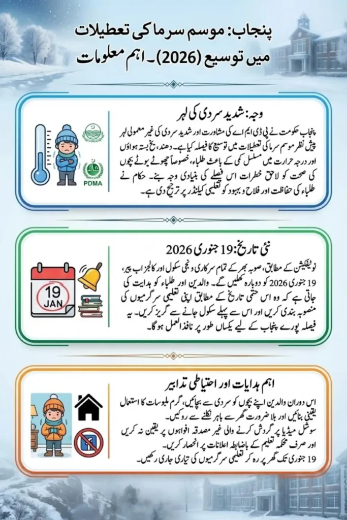 The extension of winter vacations in Punjab for 2026 is a timely and responsible decision. With extremely low temperatures expected to persist, keeping schools and colleges closed for a few extra days helps protect students’ health. Parents, students, and teachers are advised to rely on official information and prepare for the resumption of academic activities after January 19, 2026.